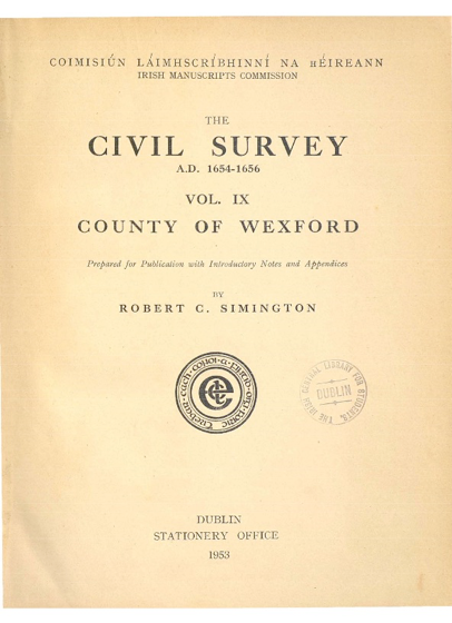 During the Cromwellian period in Ireland there were two land surveys, the Civil Survey of landholders in the 27 counties outside of Connaught (recorded by County and Barony Inquisitions) taken between 1654-1656, and secondly Petty's cartographic "chain-length mapping" land survey (aka the Down Survey, as in "laying down the chain", for measurement) of 1656-1658.(±) The information from these surveys, apart from the Census data, was mostly re-published in the 1950s and 1960s by the Irish Manuscript Commission.(&,§,+) The same Census figures, for Wexford County, are also presented in one of the works of genealogist and historian Hilary Murphy, in "Families of County Wexford"(Geography Publications, Dublin 1986).(*) The Wexford County Cromwellian Census data of 1655 to 1659 was sourced from one of only 10 available county record sets of documents where the original manuscripts survived the Crown repository fire in Dublin Castle in 1711.